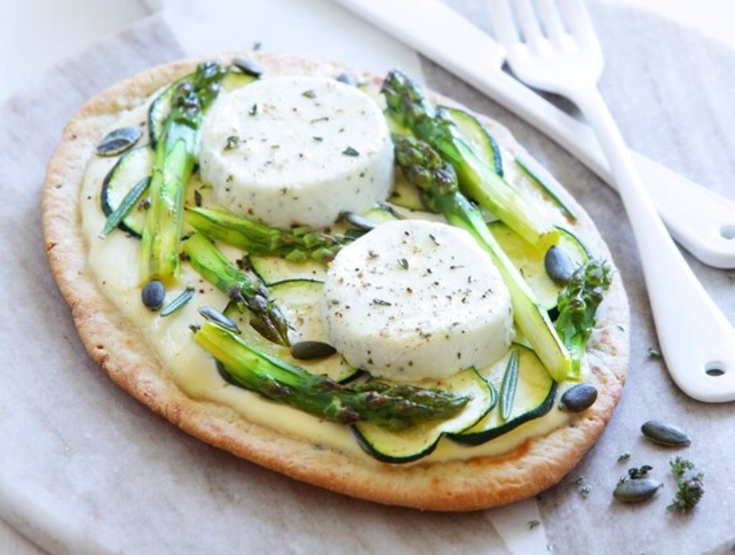 Cuisinez notre pizza naan aux courgettes asperges et chèvre frais