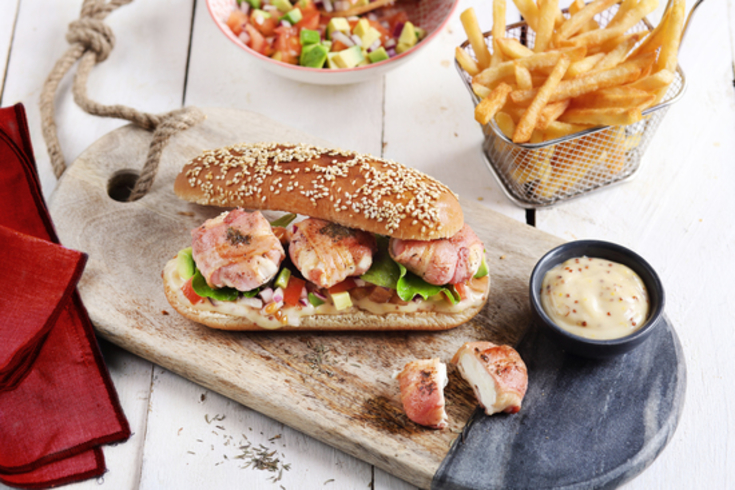 Vous êtes lassé de l’incontournable cheeseburger et souhaitez proposer à vos amis une recette facile, rapide et originale ? Laissez de côté bœuf et cheddar pour leur préférer de délicieux palets de fromage de chèvre enroulés dans de généreuses tranches de lard fumé à cuire au four ou à la poêle. Pour encore plus de saveur, préparez une sauce mayonnaise moutarde, miel et sauce pimentée, quelques feuilles de salade, des morceaux de tomates et des oignons. Dressez sur un pain à hot dog toasté… et bon appétit !