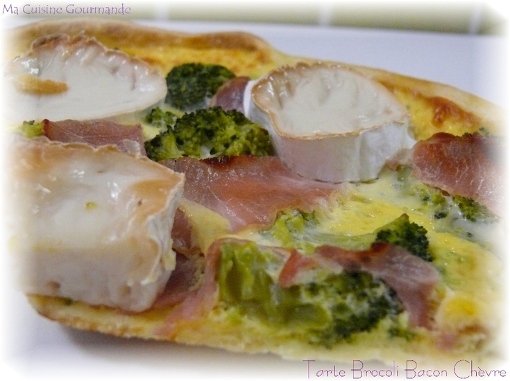 Sur le fond de tarte, disposez le brocoli. Parsemez de tranches de chèvre puis de lanières de bacon.