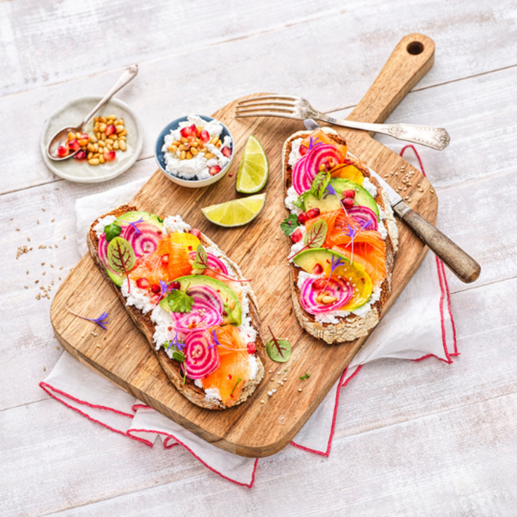 Tartinez-les généreusement de Fouetté de chèvre, disposez-y harmonieusement les tranches de saumon fumé, la betterave et l’avocat.