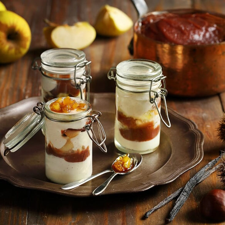 Répartissez dans des verrines un peu de brassé, un peu de crème de marron, un peu de pommes et alternez ainsi jusqu’à hauteur.